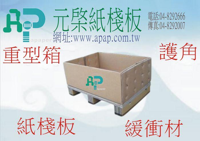 產品規格:(可依客戶需求,量身訂做) www.apap.com.tw 通用規格:100*100110*110120*80120*100120*110CM 適用產業:頗受電子業,螺絲業,手工具業,氣動手工具業,模具業,腳踏車業,軸承業,鞋材業,汽車零件,鑄造業,五金零件業,玻璃業者青睞 商品優點:安全.無蛀蟲.免煙燻.100%可回收(免煙燻費.廢棄物處理費一舉數得),質輕運費低(紙棧板重量約為木棧板之1/3,適合海運.空運),高承載力。 功能說明: 浸蠟處理增加腳座強度(浸臘高度以實際產品為主),防水功能佳,承載重強。
